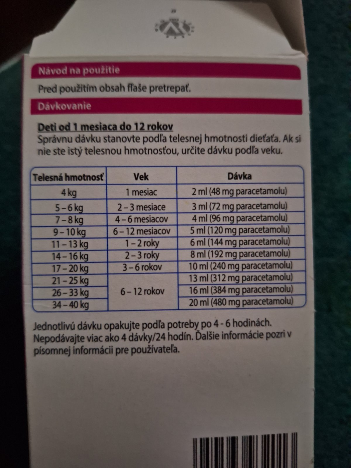 Davkovanie je 15mg/kg na jednu davku, v jednom ml sirupu je 24mg, takze 15x13:24 a vyjde ti je 8ml je adekvatna davka. Mozes podat max 4x denne.