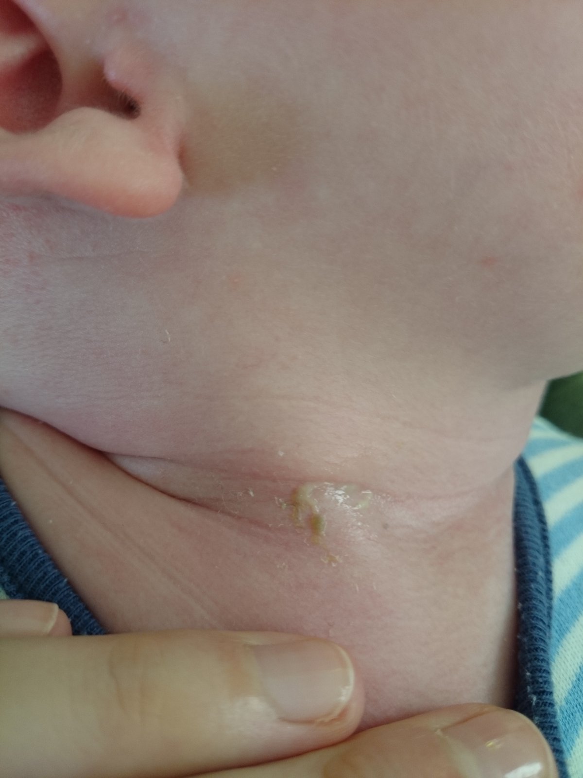 Ked mal drobcek asi tyzden-dva, nasla som mu v oblasti klucnej kosti pod krkom taku dierocku, postlacala som okolie a vyslo odtial celkom dost akoby bieleho hnisu. Od doktorky sme dostali ichtiolovu masticku, ale ani po zopar mesiacoch sa to nezacelilo a ked prstami prejdem po okoli, stale vybehne trosku bieleho. Pri inej prilezitosti som to ukazala na detskej chirurgii, ale chirurg len mavol rukou, ze to nic nie je len daky pupacik (to bolo este nazaciatku a myslela som, ze mastickou vyliecime, tak som sa nehadala).