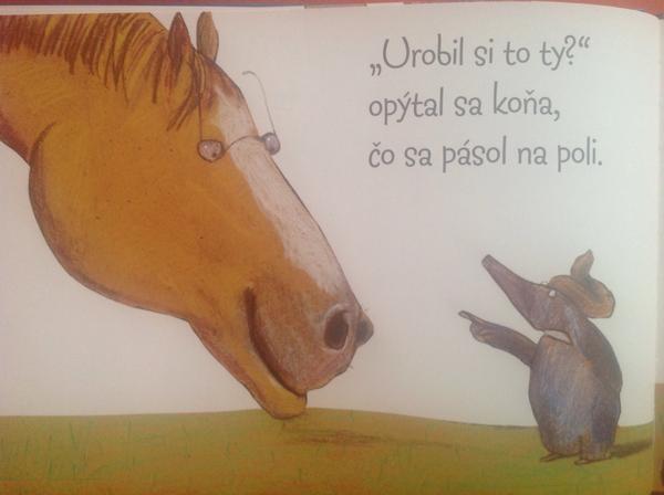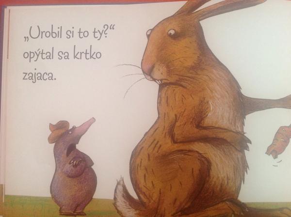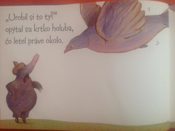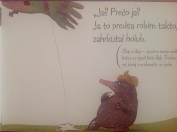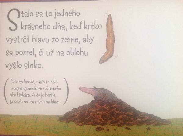 @senta_sofia @sjuzan77 nafotila som vam kusok. Este su tam koza, krava, prasa. V recenziach knizke vycitali aj zaver, ze je krtko pomstychtivy... Okrem tejto knizky, stretla som sa este so zbierkou hovienok na zamocku Orth v Rakusku, nie je to daleko od BA, na vikendovy alebo prazdninovy vylet. K zamocku je areal so zvieratkami, je tam taka ohradka s hadmi, aj akvarium pod Dunajom. A teda na konci toho arealu bola strieska a pod nou nazberane kopky trusu s popiskami od ktorych zvieratiek je. Je to mozno nechutne, no sem tam na vylete v lese, ked su bobky na ceste, deti sa mozu hrat na stoparov 🙂 Nasa pochopila cikanie kakanie na psikoch, co okolo baraku stale niekto venci. Vsimla si, ze sa psici zastavuju pri kazdom stlpiku a asi dva razy sme v trave slapli do hovienka a umyvali sme potom topanku v mlake a suchali o travu, tak to bol zazitok 🙂 Tak by sa mozno dala dajaka dobrodruzna hra vymysliet, ako okakat krtkovi hlavu... alebo ako skumat ktore je cie hovienko. No mozno ked je kakanie bolestive, tak to nepomoze ani tak, to neviem...