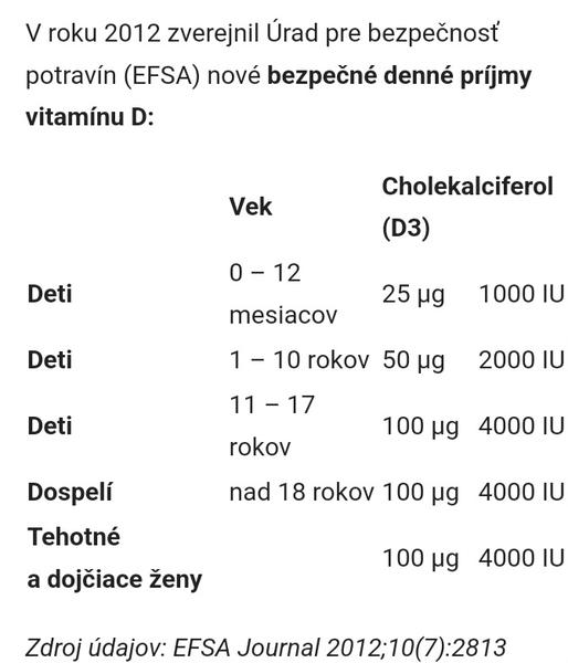 Tak je to na tebe ja davam dcerke 5 rocnej do maja a potom od srptembra a stale chodime po vonku este nechodi do skolky takze sa snazime na vonku syravit co najviac na slniecku a je chvalabohu zdravucka. Pre dospeleho ked je zdravy ta staci slniecko a vajicka ale ked ma narocnejsie povolanie a je malo na slnku tak urcite treba doplnit v zime.