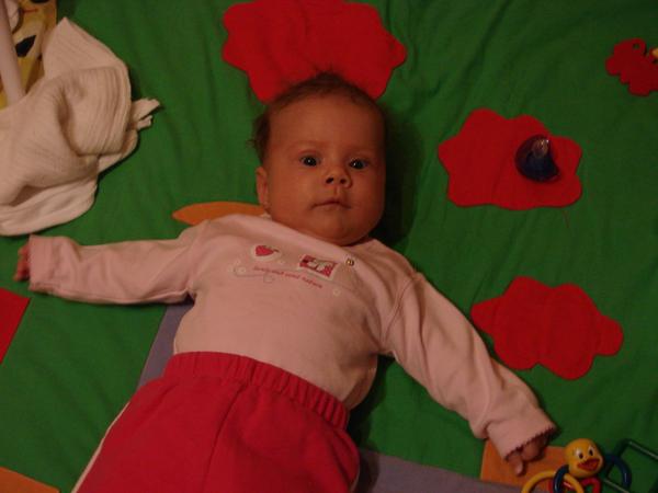 ale veď ho daj na zem, na nejakú podložku, či deku, nech má voľnosť v pohybe, prípadne nad nejakú hrazdičku nad neho. Nemá ti kam ujsť ešte🙂 Dieťa má mať hlavne voľnosť v pohybe a priestor.
