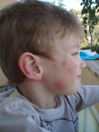 No a k naší dovče - byla to první dovča, ze které jsem se těšila domů. Aneta sice už po třech dnech dobrá, ale jinak to stálo za prd. Neskutečný vedro, pořád přes 30, poslední tři dny ke 40 stupňům. V hotelu nebrali platební karty a my jsme si museli přiobjednat klimošku a zaplatit jí v hotovosti. Jenže tím jsme přišli o skoro polovinu peněz, které jsme s sbeou měli na dárečky a výlety. Na pokoji nám nefungovala lednice, tak jsem to šla hned nahlásit na recepci a tam mě začal recepční přesvědčovat, že to vlastně není lednice, ale jakási "termoska", ve které se udržuje teplota toho, co do ní dáš. Tak jsem sprdla delegáta, že pokud jsem si vybírala hotel podle toho, že chci mít na pokoji lednici a na recepci se dozvím něco jiného, tak je asi někde chyba. No samozřejmě že lednička fungovat měla, takže pak jsem chodila 2x denně prudit, kdy jí opraví. Dočkali jsme se nové, plně funční, ale až 4. den. Večer a v noci lítala hejna komárů, schválně vám sem hodím fotku Kubajze po první noci. Ubytování dobrý, vařili taky vcelku stravitelně, ale jako příloha jen samé hranolky. Rýže byla jen 2x. Svišti zase drželi redukční dietu a první 4 dny nejedli vůbec, pak tak max. 2x denně. A to zhruba 2-3 lžíce něčeho. Polévky tam nevedli, takže ani ty nás nemohly zachránit. Když jsem jim dnes oblíkla doma tepláky, tak z nich zase spadly😠 😠 😠 Navíc Kubajz zhruba 5 minut po každém místním jídle seděl dalších 15 minut na záchodě a prděl jak o život. Z Rhodosu jsem viděla prdlajs, páč v takovém vedru se nedalo nic podnikat. A to jsem s sebou měla seznam výletů, které chci podniknout. Den před odletem jsme se rozhodli, že přeci jen na jeden výlet pojedeme, tak jsme šli na autobus, který ani po 45 minutách čekání nejel. Vysvětlení Řeků - oni zase asi stávkují.Takže jsme se vrátili do hotelu, vzali věci a šli na pláž. V půlce pobytu se asi zavařila klimoška a v noci přestala fungovat. Po zkušenostech s ledničkou, jsem prudila ještě intenzivněji a odpoledne už byla spravená 🙂 Jediné pozitivní bylo moře, krásně čisté a vcelku teplé. Objevili jsme super místo na pláži, tak to se taky dalo. Jinak pláže byly dost rozmanité, ale převaha těch s horším přístupem do moře - kameny nebo byly pláže dost úzké a byly v obležení turistů. Každopádně po třech zkušenostech s Řeckem jsem si řekla, že už nikdy více. A taky zase asi začneme lítat v zimě a ne v létě, to se fakt nedá s dětma dělat nic. Když to porovnám s Kanárama, tam jsme s nima normálně jezdili na výlety, což se tady fakt nedalo. Takže jsme byli dopol tak 2 hoďky na pláži a pak v podvečer. Ale viděli jsme i pár šílenců, kteří trávili s dětmi na pláži celý den. Což mi teda příjde hrozný.