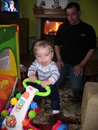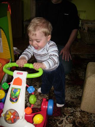 Peti malí už obchází nábytek a máme pujčené i chodítko a už s ním popochází,ale já mu to nechci ukazovat,to babička aktivne..me přijde že na to ješte nemá..hodím fotku