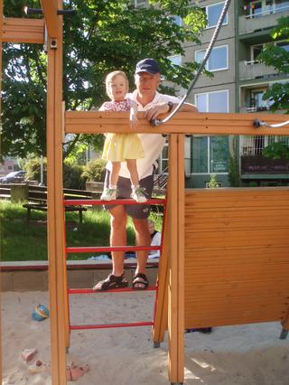 Jinak my jsme si víkendík užili, byli jsme pořád venku. A holky pozor, zjistila jsem, že Anetka umí chodit sama, bez držení, do schodů i se schodů 🙂 🙂 Jsem je vždycky vodila za ruku a teď jsme byli venku i bez kočáru a nechala jsem je běhat všude možně, konečně se totiž naučili poslouchat, a většinou jdou, kam chci já. No a Anetka zdolala všechny schody, které byly v dosahu. Jo a na hřišti jsem jí během vteřiny, kdy jsem se věnovala Kubovi, objevila stát na prolejzačce pro poněkud větší děti - kuk na foto. Tak teď tam leze pořád, ale stále nějak neví jak pořádně dolů. Ale prý je tam krásný rozhled 😎