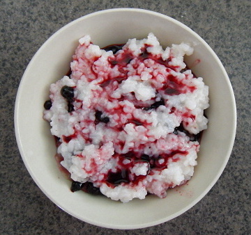 5. Poslední je svačinka - rozvařená rýže, prostřední vrstva podušená jablíčka na plátky, na vršku opět rýže a dozdobeno borůvkovým kompotem. Osladit a dochutit si musí každý podle chuti. Já když nemusím, tak cukr nedávám a když už, tak třtinový. Jinak se snažím dohnat to ovocem sušeným nebo nějakým sirupem/medem. Někdy trochu vanilky, skořice vyvařit..