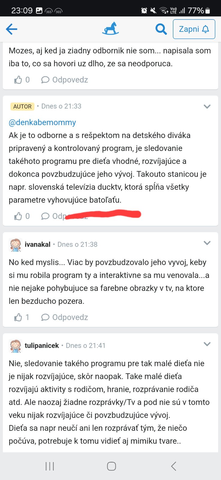 @autorka vôbec neriešim obsah v tv. Skôr všetky účinky modrého svetla, vytváranie závislosti už v úplne rannom detstve atd atd.. skús niečo o tom prečítať. Pol ročné dieťa si má čítať čiernobiele knižky, a učiť sa ako robia zvieratá, nie čumieť na duck tv 🙂