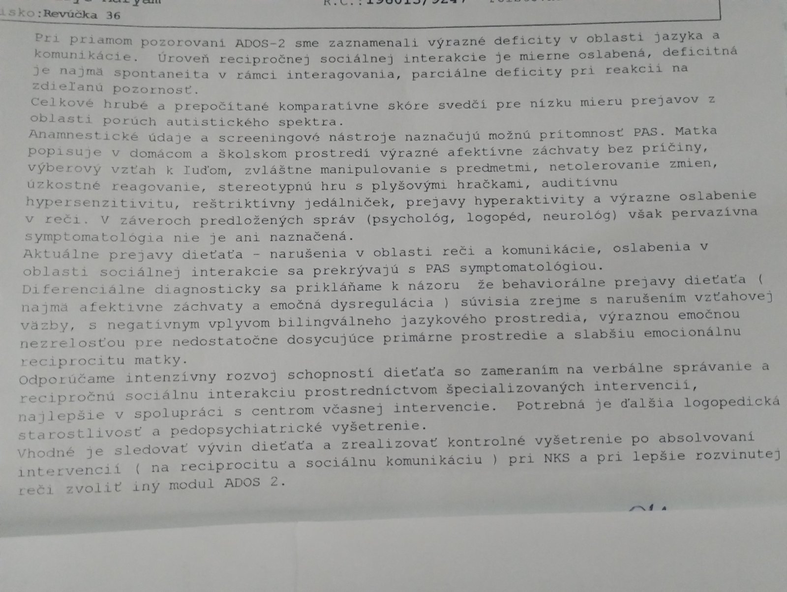 skore svedci pre nizku mieru prejavov z oblasti poruch autistickeho spektra, ale anamneza a screening naznacuju moznu pritomnost. Takze ziadny zaver, dolu sa pise, ze treba pedopsychiatricke vysetrenie.