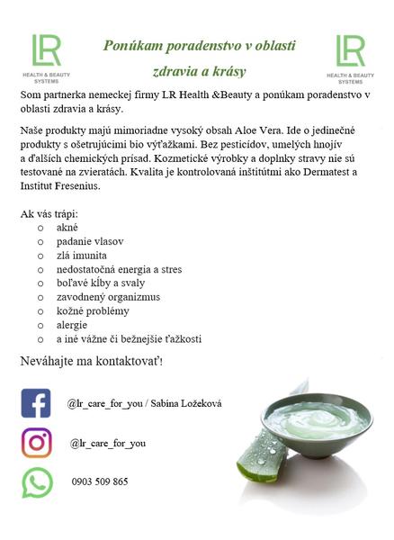 Ahojte 😊 ak ste z okolia Bratislavy a mali by ste záujem o produkty z LR alebo poradenstvo rada Vám pomôžem, kľudne mi napíšte na e-mail: jarmilka.gralovicova1995@gmail.com