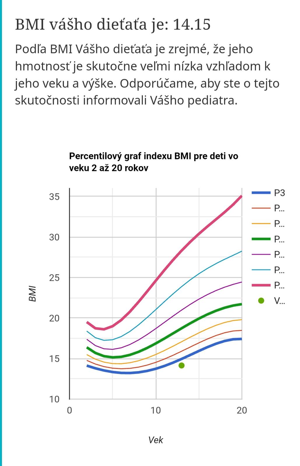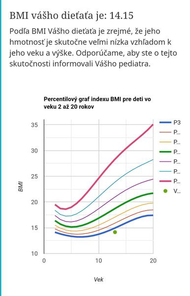 BMI ma 14,15 a je v podvyzive na cca 3 percentile tj 3% deti maju rovnaku alebo nizsie BMI