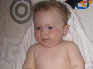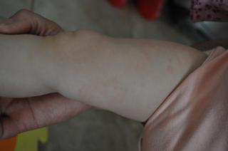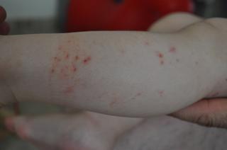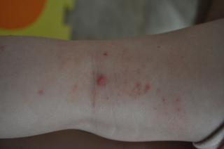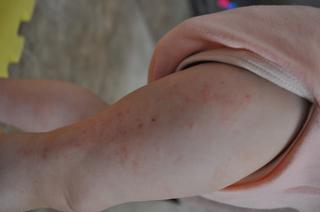 Behom 3 tyzdnov sa zo suchych miest spravil skaredy exem,ktory ju svrbel, vznikli nejake vyrazky - vsetko vyzera uz na ustupe,len ta jedna vyrazka sa mi nepaci.