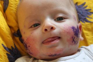 AK ťa vedie Viera, tak si v najlepších rukách. Zdá sa mi, že na lícach na tváričke sa to už lepší. Ja by som ešte raz potrela genciánou a pridala by som omytie (alebo rýchly kúpeľ) v slaboružovaom roztoku hypermangánu, možno aj potieranie antimykotickoumasťou Imazol krémpasta. Možno by som šla aj na kožné na stery či tam nie je aj stafylokok, ale to je priodvážne tvrdiť, len hádam, všetko čo som napísala si najskôr odkonzultuj s Věrou. Probiotiká, Fenistil, čaj rooibos (pre teba) a trpezlivosť. Bude lepšie, určite.