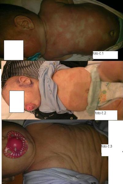 Teď mám zajímavý případ. Chlapec 6 měsíců starý, najeli na Neocate v 4M, když viděli reakci na Nutrilon allergy care. Bohužel, v době, kdy se dohojoval po reakci na zbytkové BKM v Nutrilonu AC, dostal první dávku Hexy. Nastalo prudké zhoršení, jak už to tak u silných atopiků bývá. Namazali asi 5 x kortikoidy, sice dodržovali interval.léčbu, jenomže - u ekzému infikovaného kvasinkou je kortikoid obzvláště nevýhodný, snižuje obranyschopnost kůže a důsledek vidíte na fotce č.1. V tomhle okamžiku jsme se pustili do mnou nastavené léčby, která sice stále pokračuje, ale stav se již nedá srovnat s počátkem, jak je vidět na dalších fotkách. Neboli, tohle je ukázka, z jakých ekzem.stavů se dá dítě dostat...