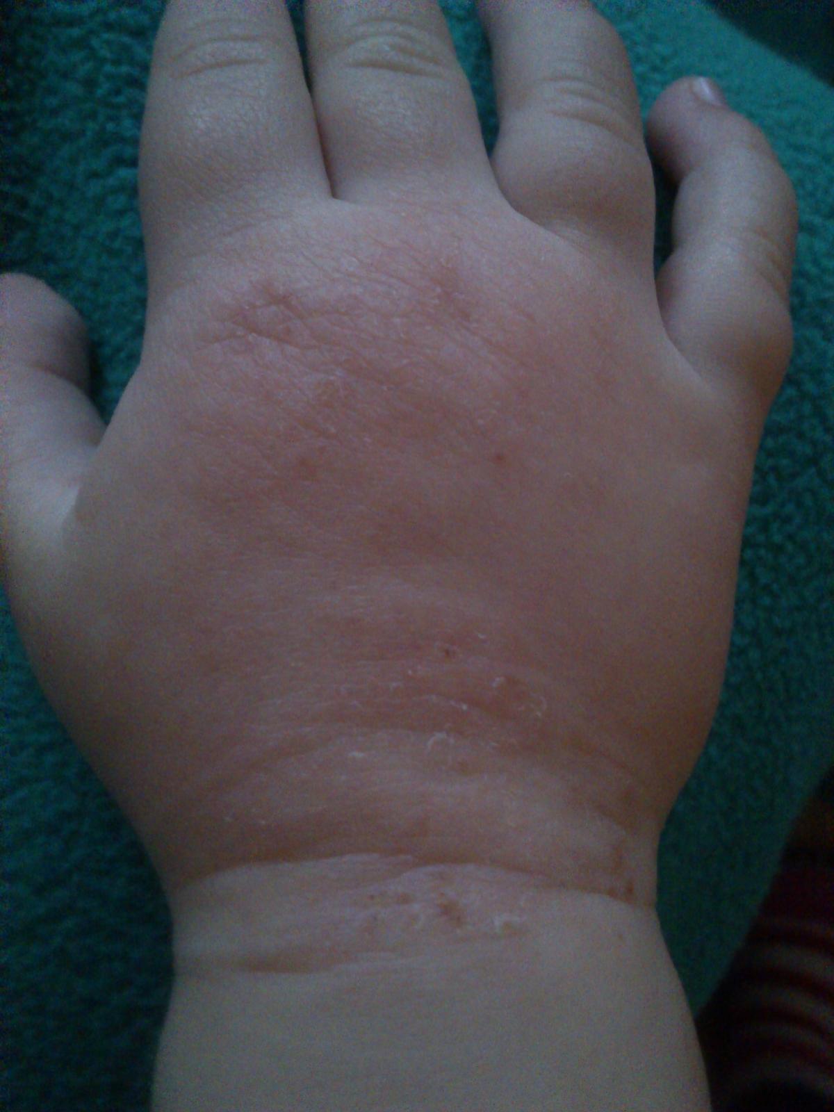 Včera večer jsem namazala na Eucerin i zinkovou mast a k ránu si ručičku zase trochu škrábala. Když to bylo namazané den před tím jen Eucerinem, tak to bylo bez škrábání. Přidávám foto - zelený podklad - ruka focená ráno - jevilo se to klidné a světlé. Foto - světlý podklad - foceno v době oběda a jevilo se to již trošku zarudle a začala si to zase škrábat. Hlavně místo, kde se zápěstí ohýbá. Probiotika dávám podle návodu v příbalovém letáku: Hylak 3x1ml (tak 3 dny a pak snížit na půlku - brát cca 7 dní) a Infants Dophillus 1 odměrku denně.