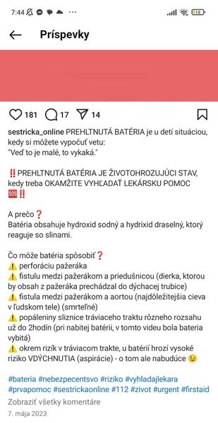 Ahojte. Myslite, že by 9 mesačne bábätko mohlo prehltnúť aaa bateriu(taká ako ide napríklad do tv ovládača). Hľadáme už 2 hodiny, tej baterky niet 😣 ak sa to stalo, tak určite ešte poobede, a musela to byt rychlovka lebo sak som tu, pri nej 😩😩😩 odvtedy 2x papala a vypila aj cele mlieko, teraz pokojne spí. Žiadnu zmenu som na nej nevidela, viem len to, ze v jednej z tých hračiek, ktoré dnes držala chyba 1 baterka (predtym tam bola, hracka hrala) a nevieme ju nájsť… ráno utekám pediatricke, ak by ešte bola hore tak sme na pohotovosti. Revem strachom o ňu, jedom na seba 😭 no muž zase hovorí, ze neexistuje aby sa také malé babo tou baterkou pred prehltnutim nedrhlo, proste, že to by som si všimla. Aj to, ze potom normálne papala a pila ako obvykle 😭