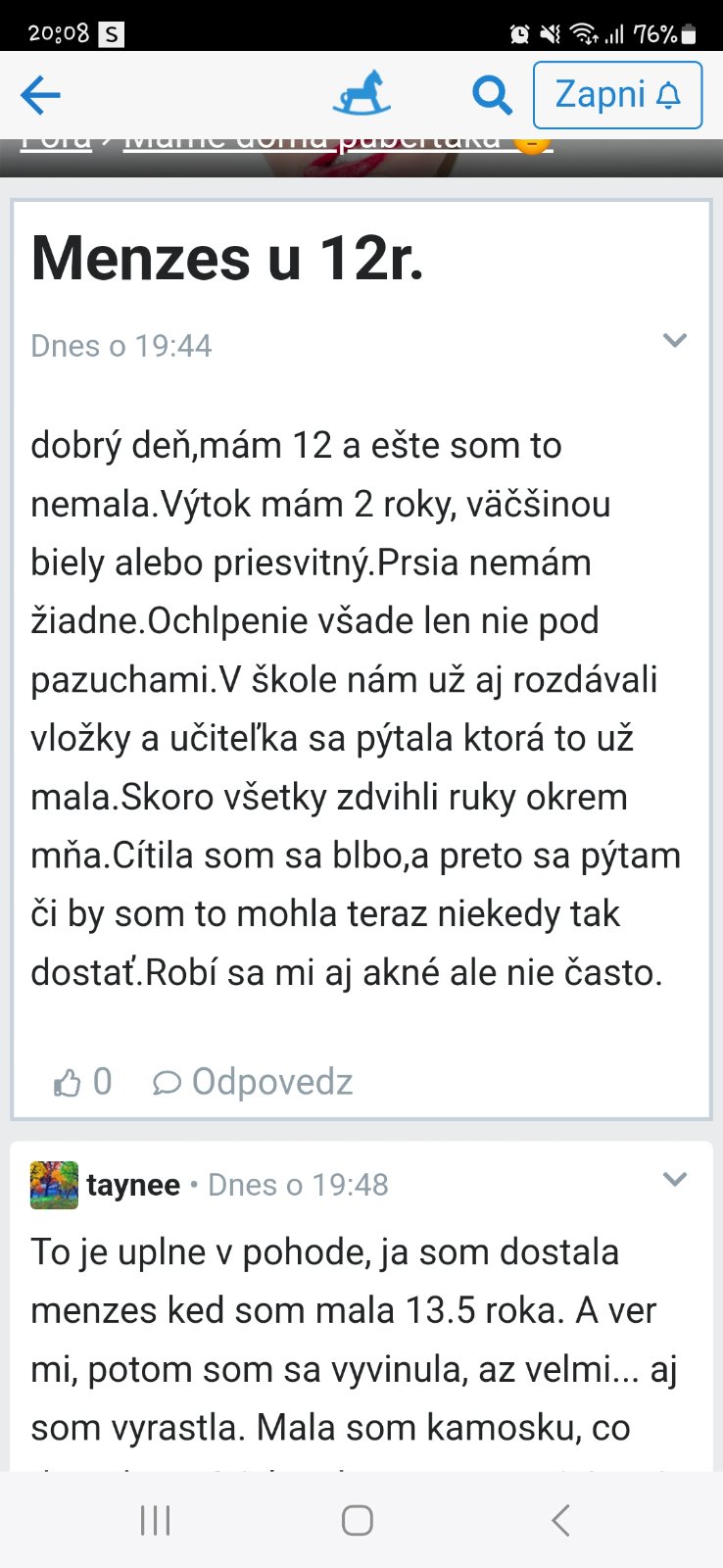 Dobrý,moja dcéra má 12 (ide máť 13) a asi 2 roky ma výtok.Prsia jej začali rásť asi cca pred 1 rokom a pol. Myslíte si že by mohla čoskoro dostať menzes? Aby som ju na to pripravila atď. Ďakujem za odpovede