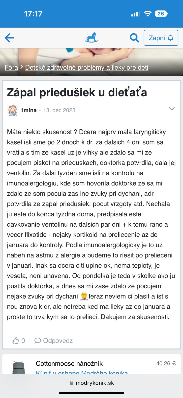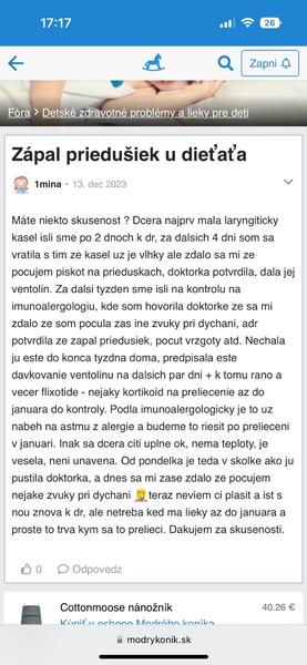 No najprv dostala ventolin na tyzden u detskej dr, za tyzden sme mali kontrolu imunoanlergologii ako som pisala, tam jej dala flixotide a ventolin vysadit za 5 dni, k tomu vyzsiu davku aeriusu ktory berie stale. Potom bola tyzden v skolke, zas silnejsie vrzgala, po tyzdni v skolke zas k detskej dr kde potrvdila ze ano cele jej to tam vrzga 🤦 spravili druhy krat vyter, za tri dni kontrola....medzitim dostala horucky a z vyteru cosi vysli uz som zabudla presne co, takze atb. Teraz mame ist za dva dni na kontrolu, teoloty uz nema, citi sa dobre. Ale kasle stale rovnako ako snad uz posledny mesiac a tie priedusky sa mne ako laikovi zda ze stale pocut obcas ked jej dam.ucho na hrud. Tak ja uz fakt neviem co budeme robit. V januari ma aj dalsiu kontrolu na alergologii