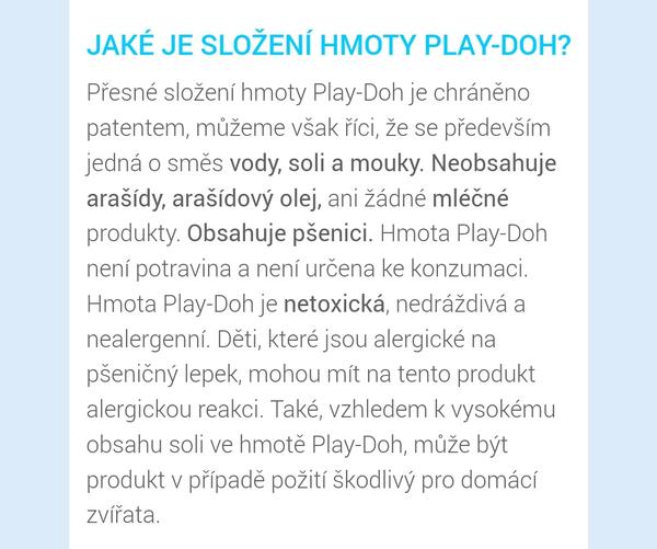 Play doh je zdravotne nezavadna. Pise, ze je to muka, sol, voda. A este nejaka speci zlozka, co nie je uvedena. Nemalo by mu to sposobit nic, ale jest sa neodporuca. 🤷