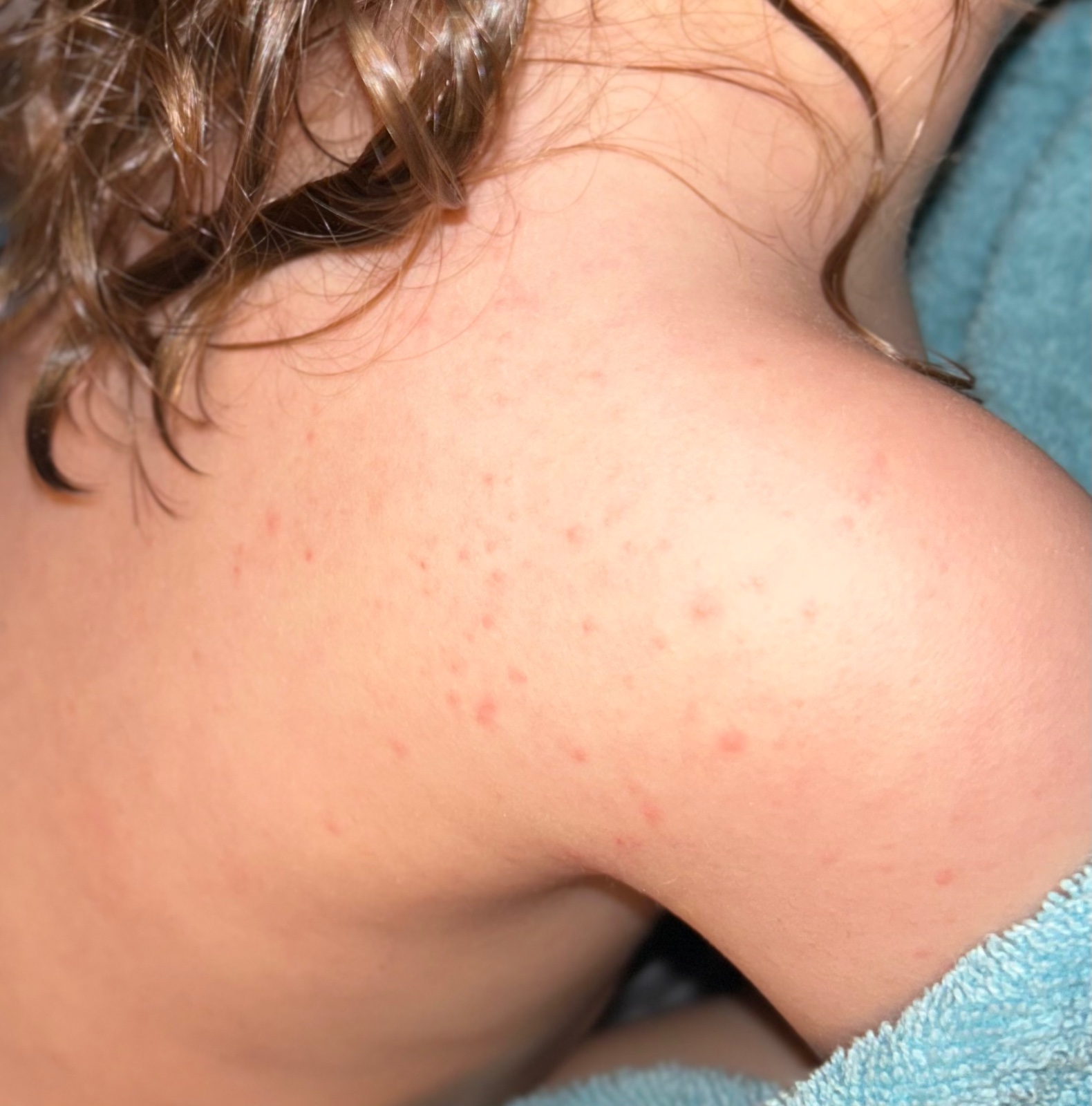 Výsyp začal jednou, dvomi vyrážkami na pliecku, na kľúčnej kosti, pod rebrami a vzadu na boku. Na druhý deň pribudlo pár ďalších, ale tiež tak roztrúsene, za uškom, na lopatke, na hrudnej kosti a tak a až potom sa to rozbehlo naplno. Aj u syna škôlkara, aj u dospievajúcej dcéry, aj u manžela.