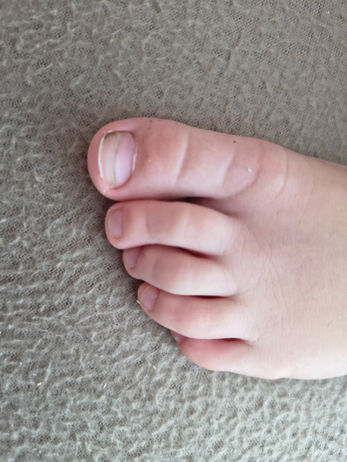 Ako pedikerka vidím ze dieta nosi veľmi úzku topánku. Prsty nemajú dostatočný priestor a preto sa krivia. Pozri, posledný palček sa začína riadne deformovat a schovávať pod ostatne. Na palci velkom je vzhľadom nedostatočného priestoru vyvíjaný tlak, preto je taky dvojitý a predpokladám ze začne časom hrubnut. Aké topanky mu dávaš? Aké má ponožky, pancuchy..to všetko zohráva dôležitú úlohu.. musi nosiť správnu velkost.. a hlavne šírku