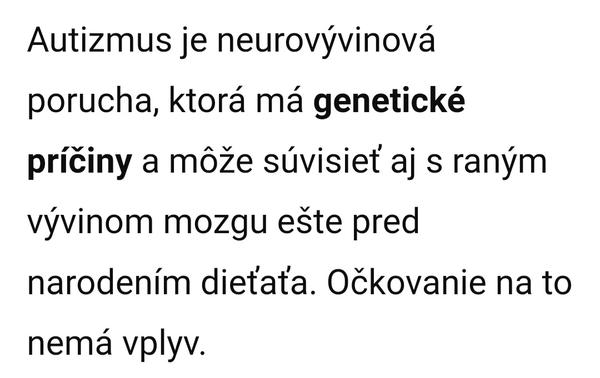 @lienka.7 tu sa mýliš ty, ako píše očkovanie bolo spúšťačom autizmu a nie že ho spôsobil...aj keď sa narodil ako ty píšeš s autizmom vôbec ale vôbec sa mu nemusel prejaviť. Ale bohužiaľ niečo ho spustilo...u nich to bolo očkovanie. Môj syn má dve autoimunitné ochorenia, spustené po silnom stresovom zážitku... Keby to nebol zažil to čo zažil verím tomu žeby tie ochorenia neprepukli.....