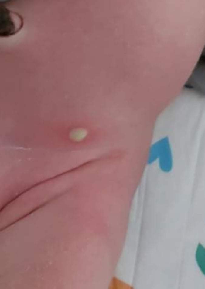 toto je realna fotka ? kludne to moze byt stafylokokova kozna infekcia a moze sa to sirit sla by som u tak maleho dietata na pohotovost aby hnis vypustili a dali atb mast