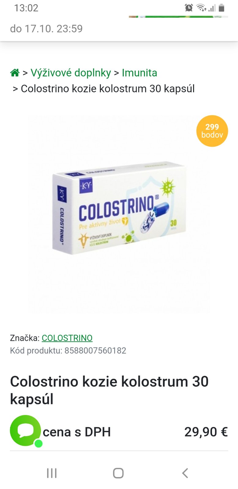 @sonah Dobry den, ospravedlnujem sa, ze reagujem az teraz,ale prehliadol som Vas odkaz. Co sa tyka produktu Colostrino je to velmi zla volba. Tento produkt je ciste marketingovy, maju peknu stranku, silny podporny marketing, peknu krabicku, ale ked sa pozrieme hlbsie ponukaju malo. Maju 2 formy, bud po 10 kapsul alebo po 30 kapsul. V jednej kapsule je 100 mg kozieho kolostra, co je velmi velmi malo. Pozrite sa na ine produkty, tie maju az 300 mg kozieho kolostra, to je 3x viac. Udavaju ze uzivanie ma byt 1-2 kapsuly denne. Moj nazor je ze jedna v ziadnom pripade, to je velmi nizka davka, ktora nemam v podstate ziadny vyznam a ucinok. Dve su tiez malo, takze tento rpdukt by sa mal uzivat v davkach aspon 5-6 kapsul denne. Prepocitajte si potom cenu, vyjde Vam uplne neunosna. Tento produkt Vam jednoznacne neodporucam!!!