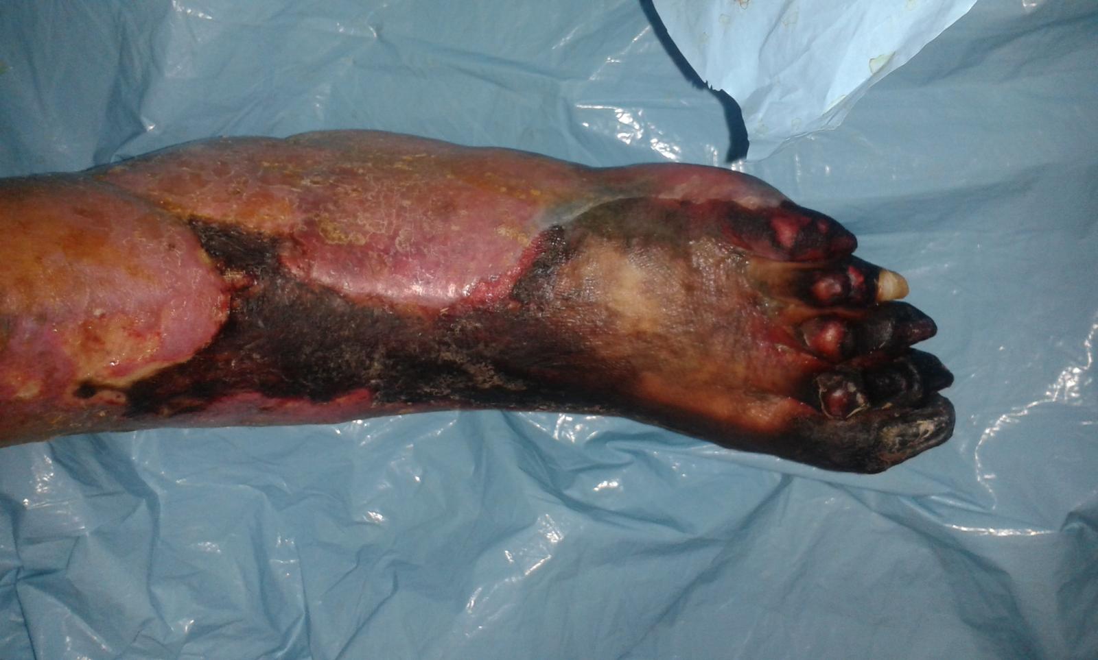 ...................typicka gangrena....tj uplne odumrete tkanivo, ktore uz len hnije... a ta hniloba a vnej infekcie sa dostanu do krvneho obehu a zanesu organy.........Amputacia je jedine riesenie, nieco co je uz mrtve sa neozivi. Babicka ma uz vela rokov, mozno zomrie pri operacii....treba sa nato pozerat realne, ale aspon bezbolestne. A mozno prezije,preco nie.