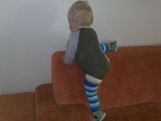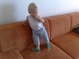 Od štyroch mesiacov sedel (no nech si myslí kto chce, čo chce, jednoducho som ho nedokázala udržať v ľahu alebo na brušku, furt sa dvíhal - pravidelne cvičil brušáky, akonáhle som ho dala ľahnúť, rev na celú bytovku... a neprestal, kým sa neposadil. V piatich mesiacoch sedel bez opory a bez toho, aby padal, proste ako sviečka. V siedmych mesiacoch stál v postieľke, od deviatich lietal okolo nábytku, od dvanástich chodí sám.. teraz už behá ako strela. Je nonstop v pohybe, keď nespí, tak si nesadne. Ani najesť sa nevie v kľude, ani neviem akým zázrakom som dosiahla, že aspoň väčšinu obedu spapá v stoličke, ale večne sa krúti, kope nohami, robí niečo rukami, proste neposedí.... zvyšné jedlá počas dňa jeme za pochodu... Som rada, že som vyhrala nad ním so stoličkou aspoň počas obeda.... Cez deň spí už iba raz, hodinu a pol. Zaspáva pekne, spí celú noc. No ráno okolo piatej je ako na baterky... Všade sa štverá, vylezie na gauč, zlezie z neho, vylezie aj na opierku gauča 😲 😅 , postavil by sa aj na hrot ihly, len aby sa dostal k tomu, čo chce. Hračky ho nezaujímajú, s ničím sa nehrá dlhšie ako sekundu. Ak sa mu niečo nedarí, nevie, začne revať, hádzať sa do zeme, so všetkým hádzať...