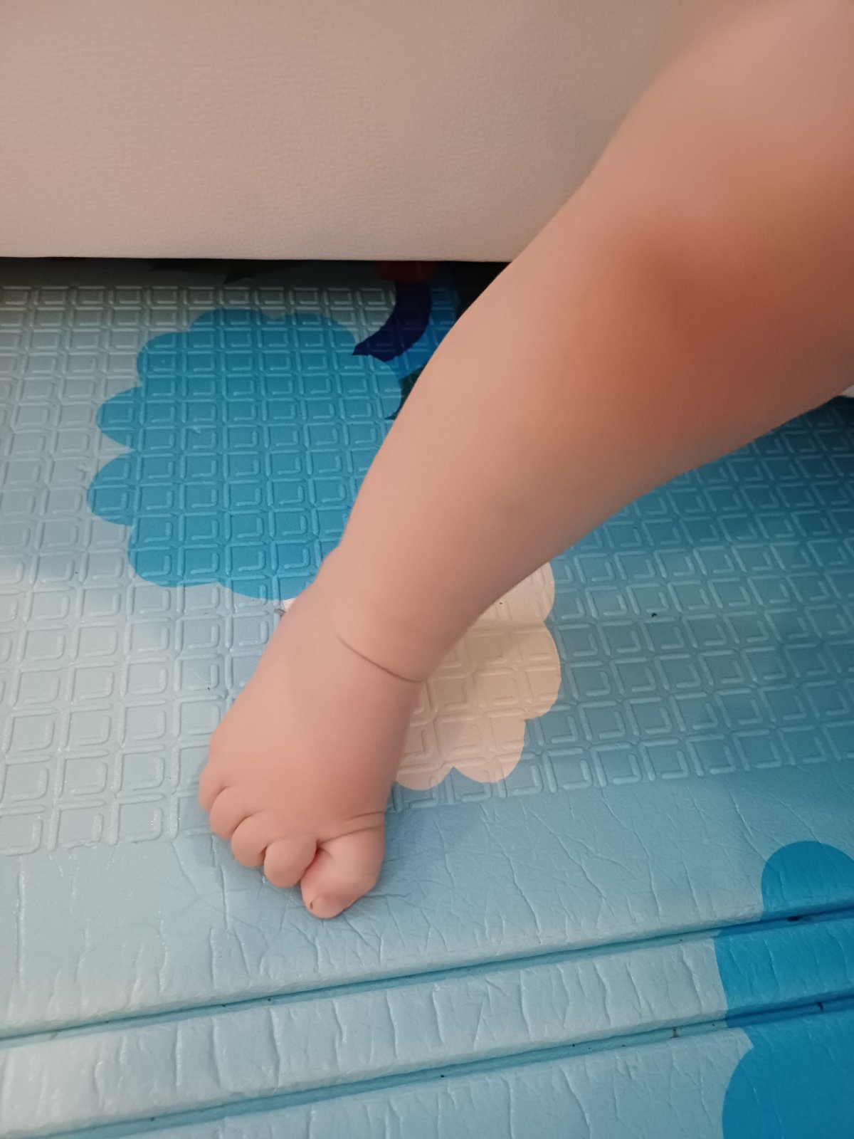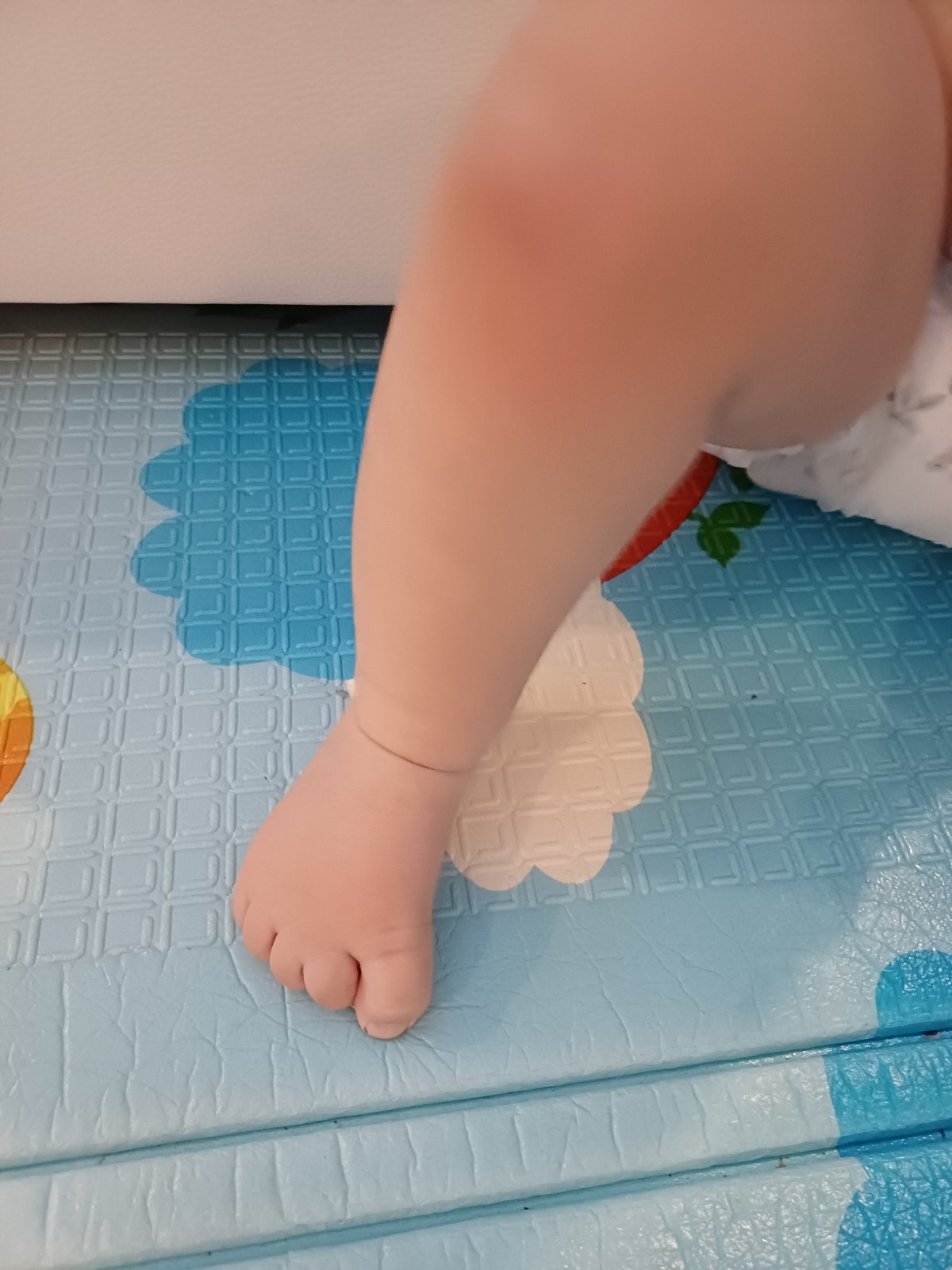 Takú foto nemám,ale on tu nožičku 1 aj druhú na striedačku v kolene pokrčí a zaprie celé chodidlo do zeme...ako keby sa chcel odraziť hore,ale tam to proste zatiaľ končí, nevyšvihne sa na nohy...niekedy sa tak aj hrá, že jedna noha kolenom na zemi,druhá pokrčená v kolene a opiera sa o stolík a tak sa hrá...akurát že ho "kýve" zo strany na stranu a pokrčená nožička sa mu trasie