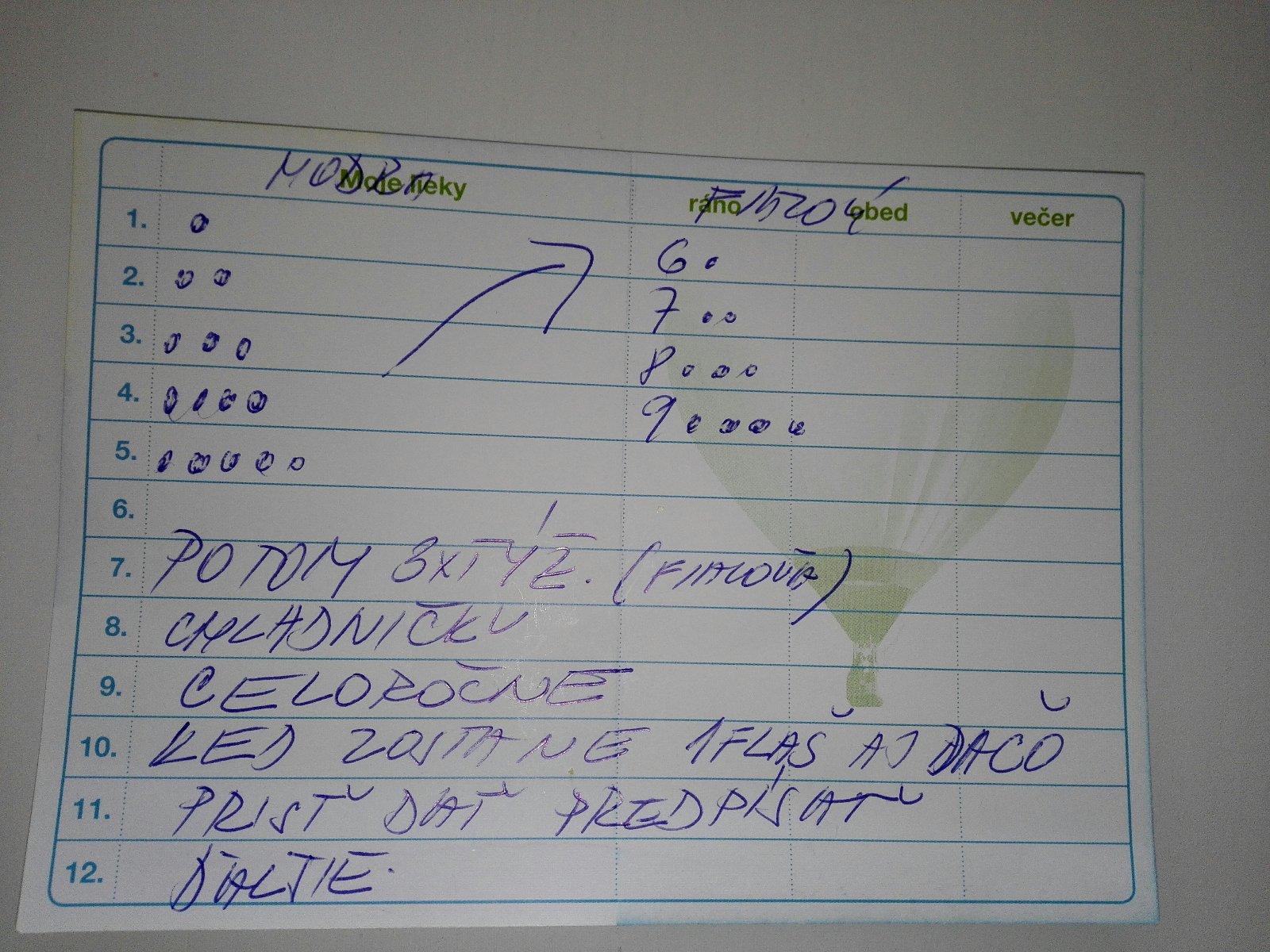 No ja som z toho pochopila, ze prvych 5 dni modru flasku a potom 6-9 den fialovu a tie bodky podla mna znamenaju pocet kvapiek, aj ked 4 kvapky z fialovej na 9. den sa mi zda dost, lebo napr. ja beriem 2 kvapky denne..A mas tam napisane "potom 3x tyzdenne", to znamena, ze 3-krat do tyzdna, nie 3 tyzdne, takze ich ma brat 3-krat do tyzdna, ale nie je mi jasne, kolko kvapiek, ci tie 4, ako je uvedene pri 9. dni..Kazdopadne modra flasticka sa uziva iba na zaciatku a potom uz len fialova, v dalsich krabickach uz tu modru ani nebudete mat a treba vzdy dat pozor, aby ste vcas objednali dalsie balenie, kedze dodanie trva okolo 5 tyzdnov..No ja by som tam aj tak zavolala a este raz sa spytala..
