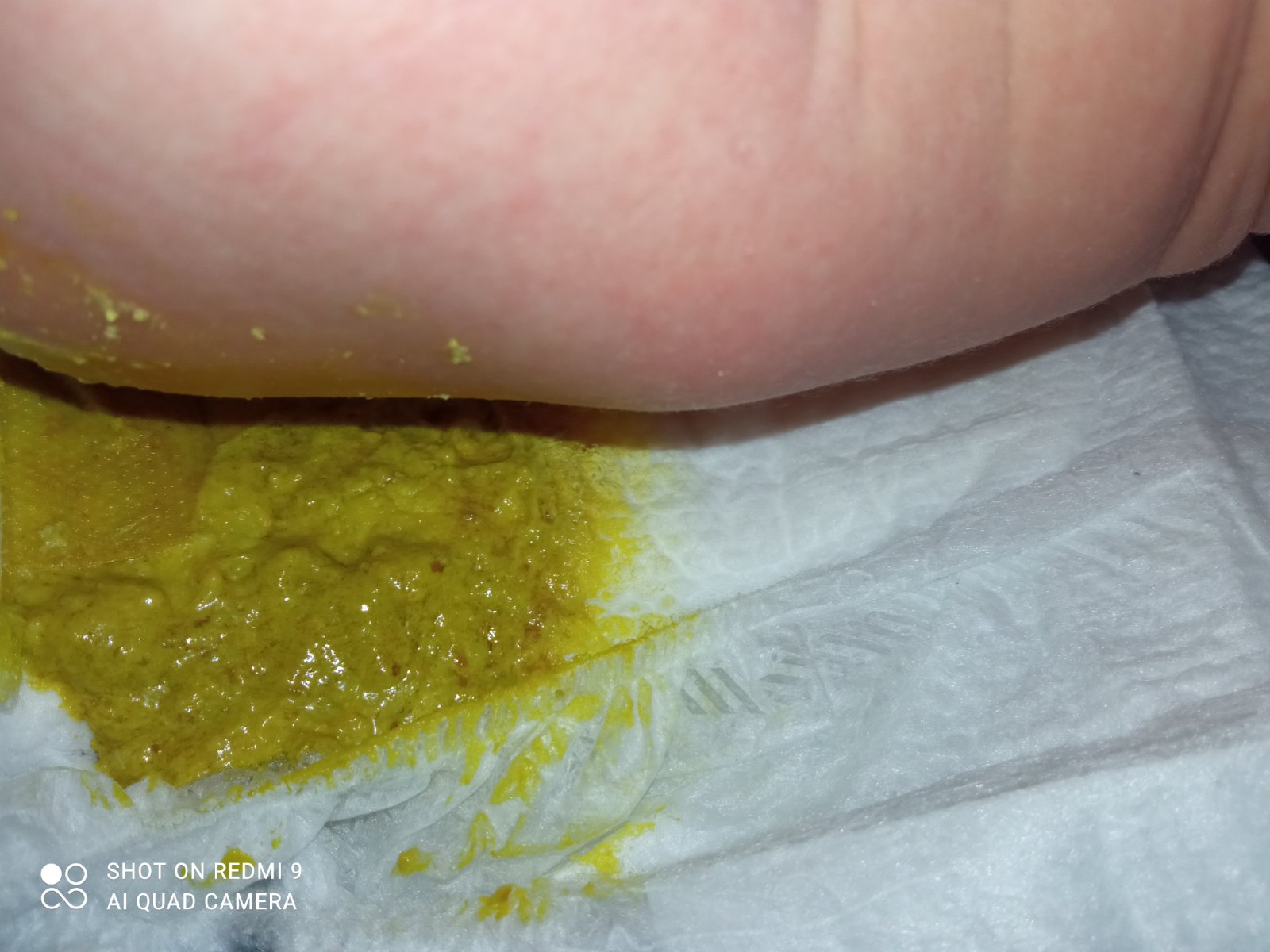 Dobrý vecer,dcéra je momentálne tretí deň na tomto mliečku kvôli ABKM a atopickemu ekzému na lickach. Je takáto stolica ok? Na fotke nevidno úplne ale je zelenozlta,len či tá konzistencia môže byť taká riedsia. Či je to ešte skoro hovoriť keďže je tretí deň na tomto mlieku. Ma aj koliky,problém s prdenim a tak. A za ako dlho by sa mali príznaky zmierniť? Vďaka