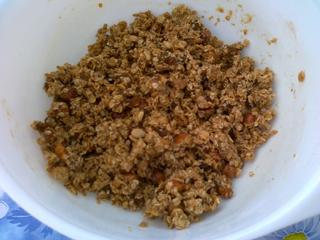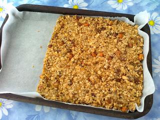 mokre so suchym zamiesat, vznikne akoby taka sypava zmes, ktoru natlacite na plech vystlany papierom na pecenie na rozmer 20x20 cm a dat upiect 20 min na 180st, este teple nakrajat na plechu a nechat tak (mozno sa budete cudovat, ze toto ma drzat pokope?...kludne si na dve hodinky zapnete MK a potom sa vratite k plechu a naozaj, uz ich len pooddelujete a mozete chrumkat 😀).....vdaka arsidovemu pyre a medu sa to peklne zlepi dohromady 😉