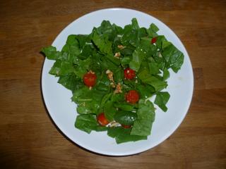 Nasi maju v zahrade spenat, tak ho vyuzivam ako sa len da. V surovom stave je celkom dobry. S cherry-dajkami, orechami a zalievkou je super. Zalievku som urobila z oleja, medu z agave a stavy z polky citrona. Odjedala aj dcera.