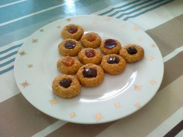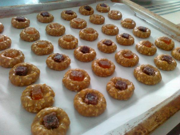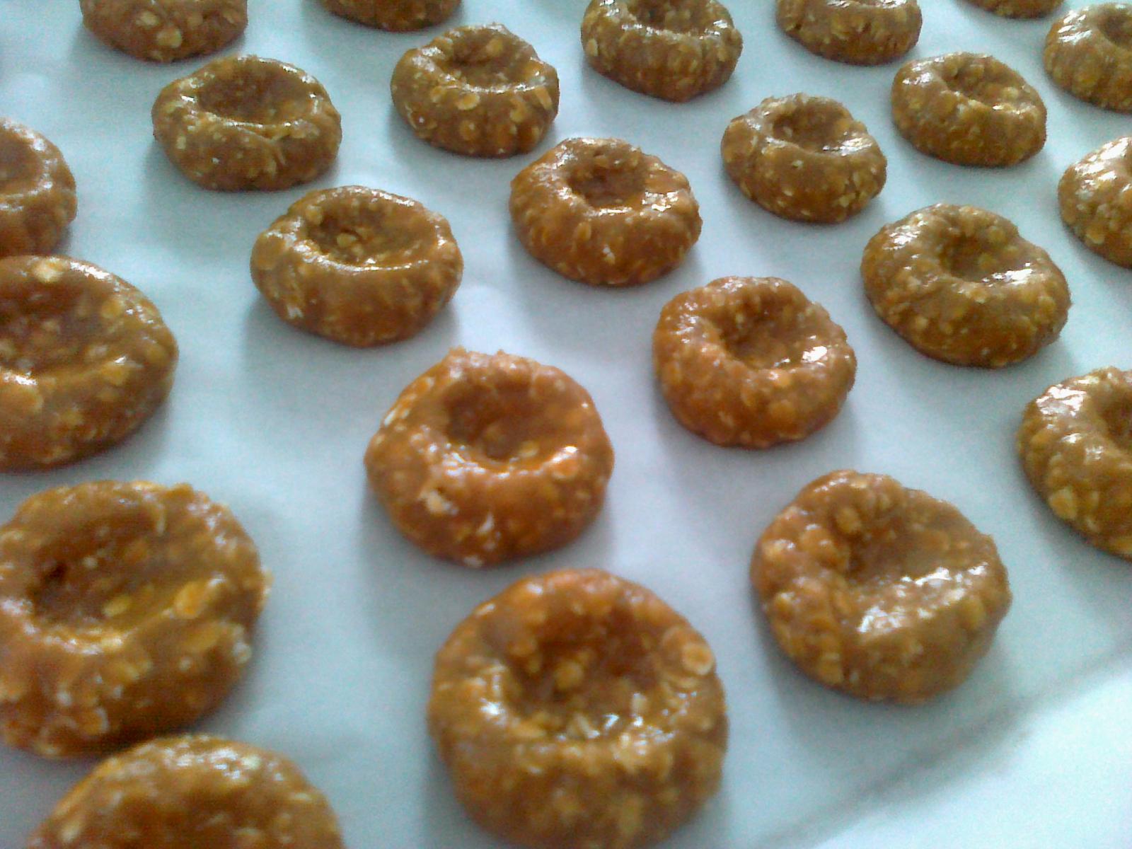 - na plechu gulky roztlacit pomocou ukazovaka (vznikne tam mala jamka, ktoru mozete niecim vyplnit......ja som tam davala ovocne zele....niektore sa roztopili, niektore ostali v povodnom tvare.....kolaciky sa mozu najprv upiect len s jamkou a po upeceni sa moze do jamky dat lekvar a pod.)