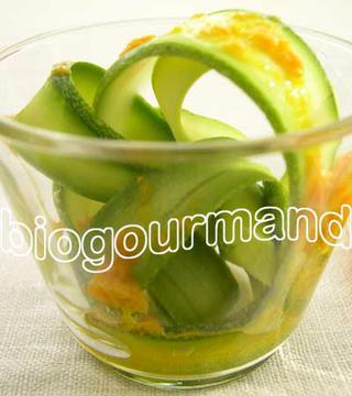 neosupanu umytu cuketu nastruhame pomocou skrabky na tenke dlhe rezance, dame do misy a zalejeme zalievkou: zmixovat mrkvu, olej, drozdie, stipku bylinkovej soli