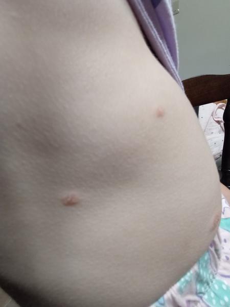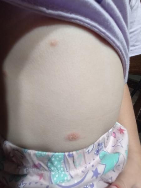 Najmladšej dcére sa začali vyhadzovať zhruba pred týždňom vyrážky. Najskôr bola jedna (najväčšia na foto) až včera už viac.... Svrbila len tá jedna prvá...
