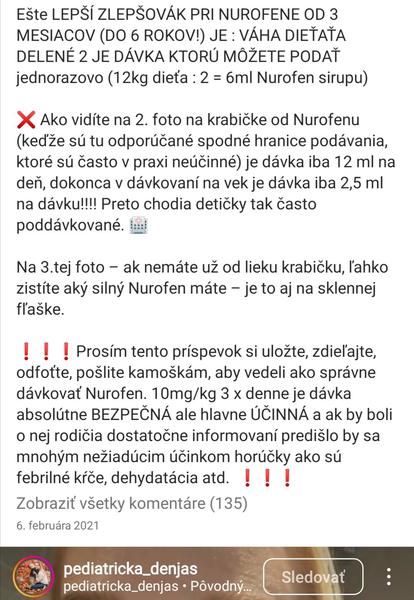 @lenka22031 pise velmi dobry postreh, davas mu velmi nizke dávky lieku, preto sa nedari znížiť horúčku.. Najdi si na IG profil pediatricky denisy jasovej, ona velmi dobre vysvetľuje dávkovanie tychto liekov, posielam screen na ukážku.. Cize namiesto 4ml nurofenu mu daj 8ml