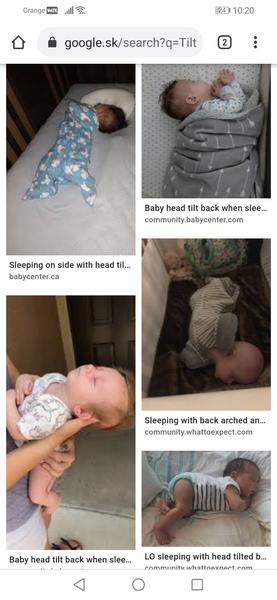 Moja malá (7 týždňov) občas spí tak, ako to bábätko na poslednej fotke. Ale nezdá sa mi, že by mala nejaké problémy, a aj lekárka na kontrole zhodnotila že je ok. hlavičku dvíha a vlastne už aj drží a od príchodu z pôrodnice sa vie pretáčať z boku na chrbát a z chrbta naspäť na bok (ale bola malinká, mierne predčasne narodená a čítala som, že malé ľahké bábätká ľahšie otočia telíčko). A niekedy sa mi zdá, že to zakláňanie robí, keď sa jej vracia mliečko a keď sa veľmi pahltne nadojčí.