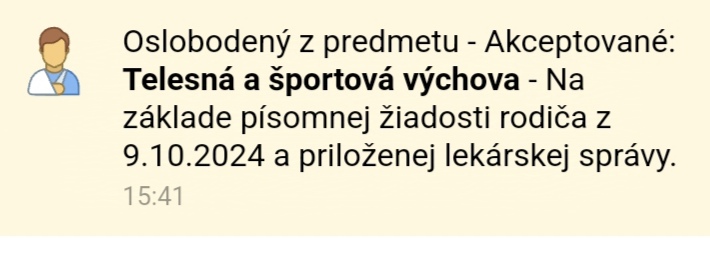 U nas nepomohlo nic, ani ciastocne oslobodenie, telocvikar sa riadil podla seba, decko sa dusilo..nakoniec sme museli dat celkove oslobodenie.strasne nervy som mala