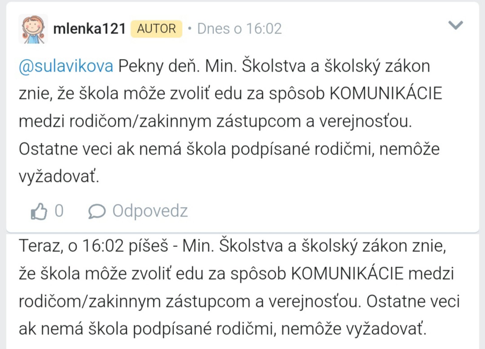 Teraz, o 16:02 píšeš - Min. Školstva a školský zákon znie, že škola môže zvoliť edu za spôsob KOMUNIKÁCIE medzi rodičom/zakinnym zástupcom a verejnosťou. Ostatne veci ak nemá škola podpísané rodičmi, nemôže vyžadovať.
