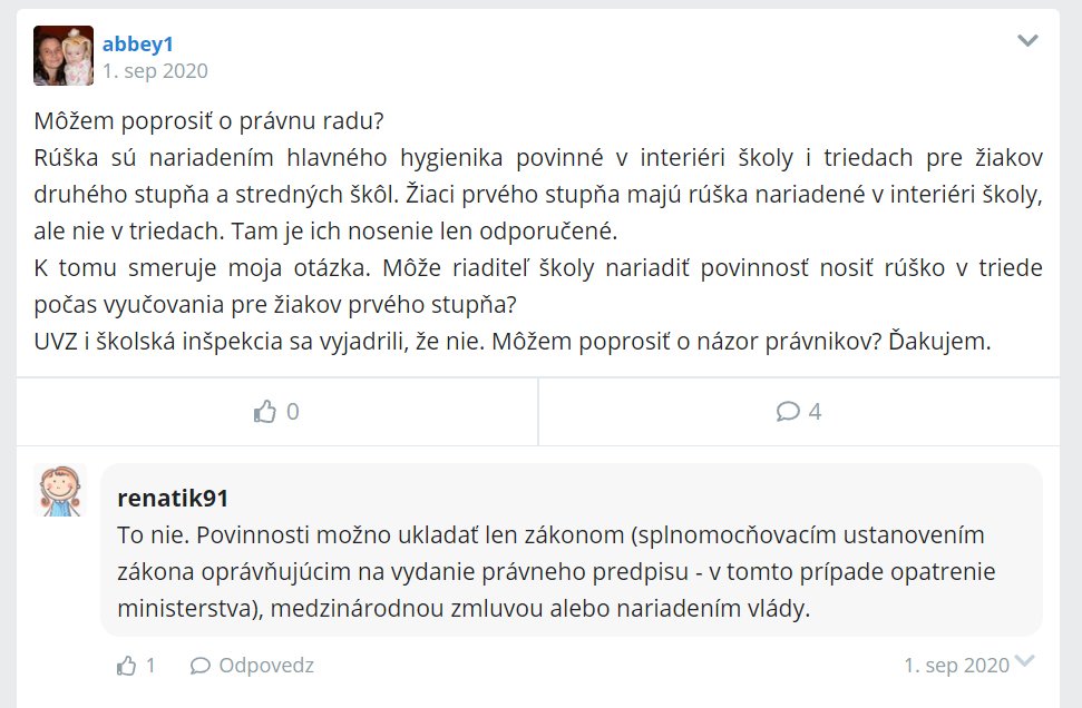 Vcera nam p. ucitelka povedala, že hoci to nie je povinne, trva na tom, aby deti mali rúško aj počas hodiny. Ja teda nie som nejaka uzkostliva matka a som aj za nosenie masiek - ale príde mi to ... no čo ja viem, už trochu prehnané. Prváčence? Vcera sa tam tie deti potili, doslova kropaje pod tym ruskom, v triede teplo. Po 2 hodinách som ja ako dospela mala co robit, detto ostatni rodičia. Jedna mamina tam bola tehotna, musela sa ist von nadýchať čerstvého vzduchu lebo sa jej motala hlava. Potom ked sme okolo obeda vyšli pred skolu tak po školskom dvore behali staršie deti a tie okrikovali učiteľky, že si maju dat ruska. Aj vonku? 😢😢😢😢
