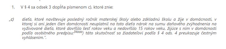 „c) dieťa, ktoré navštevuje posledný ročník materskej školy alebo základnú školu a žije v domácnosti, v ktorej si ani jeden člen domácnosti neuplatnil na toto dieťa "nárok na sumu daňového zvýhodnenia" na vyživované dieťa, ktoré dovŕšilo šesť rokov veku a nedovŕšilo 15 rokov veku, žijúce s ním v domácnosti podľa osobitného predpisu;34aaa) táto skutočnosť sa žiadateľovi podľa § 4 ods. 4 preukazuje čestným vyhlásením.“