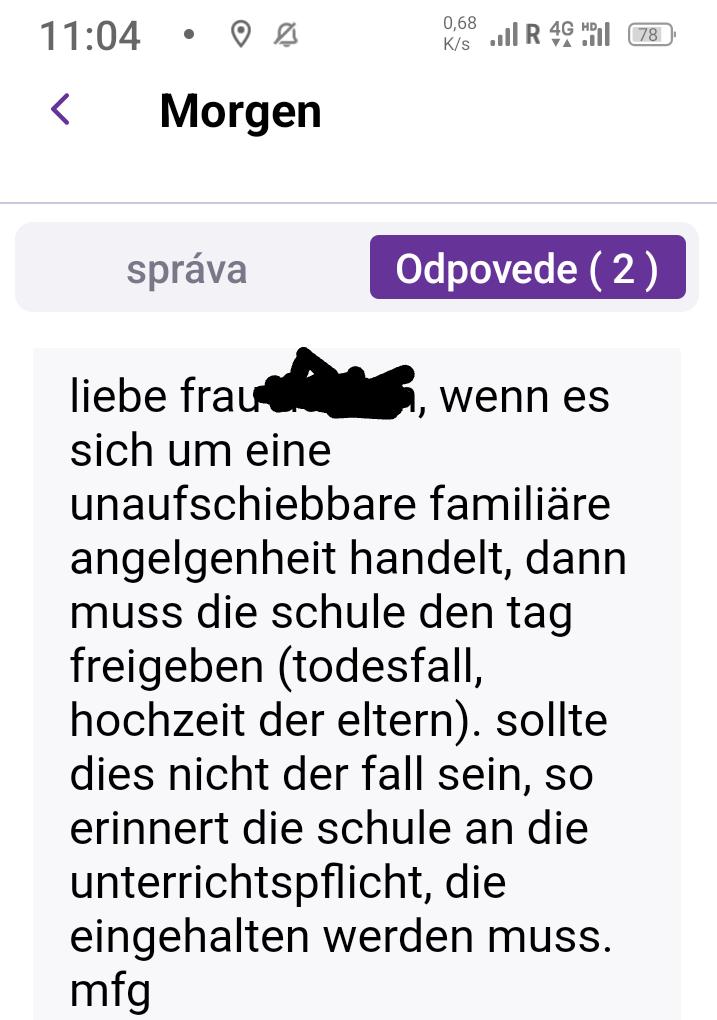 Normálne sa musím smiat. Syn,samé jednotky,od začiatku školského roka nevynechana ani minúta. Piatok pred prázdninami som ho chcela nechať doma. Už sme mali fakt dosť. Podotýkam,mali štyri hodiny telocvik a náboženstvo a opakovanie, kedze v piatok nedostávajú ulohy a ani nepreberá ju nové učivo. Je to taký oddychový deň. No a odpoveď na žiadosť uvoľnenia z rodinných dôvodov,viď nižšie. Podotýkam,kebyže to chcem hodiť na ktorúkoľvek rodinnú udalosť,si vypýtajú potvrdenie a riešili by to už vyššie... Nejaké pokusy s plným kopcom ,hmmm,skúsim,možno to prejde,keď ich tak vysokujem. Ale nerozumiem tomu naozaj. Okrem iného sa vykrikuje,čo majú rodičia robiť s toľkými prázdninami,ocrkami a kde na to majú vráť voľno a na druhej,to je vlastne v pohode ..a ešte sa dá aj pomimo prázdnin.