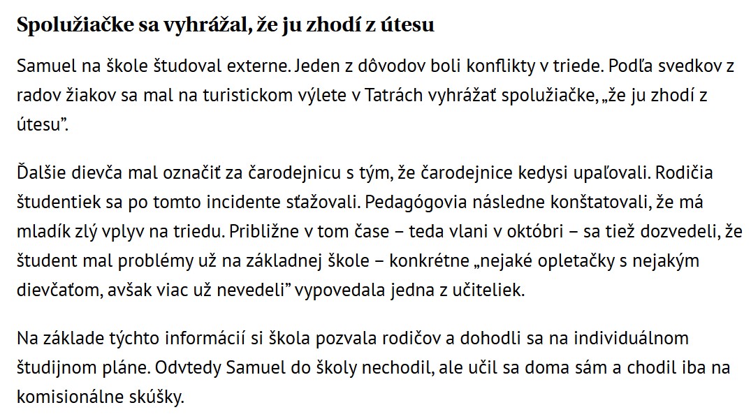 Tiez som si vsimla, hlavne ked hned isla sprava, ze mali prist na skusku s nim policajti. Ako... mne to pirde take schizofrenicke, a podla mna by o tomto uz nemali ani pedagogovia rozhodovat kto bude/nebude na vyucovani, koho dovedie doprovod/koho ni, na jednej strne sa zo vsetkho robi drama = staci ze zle pozru na seba deti pomaly a rieis sa sikana, na druhej, ked sa ukaze ze ma dieta problem, zanedba sa to takto... Ani neviem ako to vyjadrit, take polovicate riesenie, chyba radikalne riesenie ako to ma byt, proste nevprace sa do koze = treba riesit co sa ide diat. A nie tvarit sa, ze nic sa nedeje. Vylucenie zo skoly, docasne vylucenie atd, by sa v dnesnej dobe malo stat beznym nastrojom pri poruseniach skolskeho poriadku. S ohladom na vacsinu. Mozno sa to tu aj pisalo. A ak je raz niekto sibnuti a ohrozuje deti, mal by byt vyluceni, ci ma nema dokoncanu skolu, ci na to rodic ma/ci nie, nenajde riesenie = kludne detsky domov, ustav, polepsovna hocico.