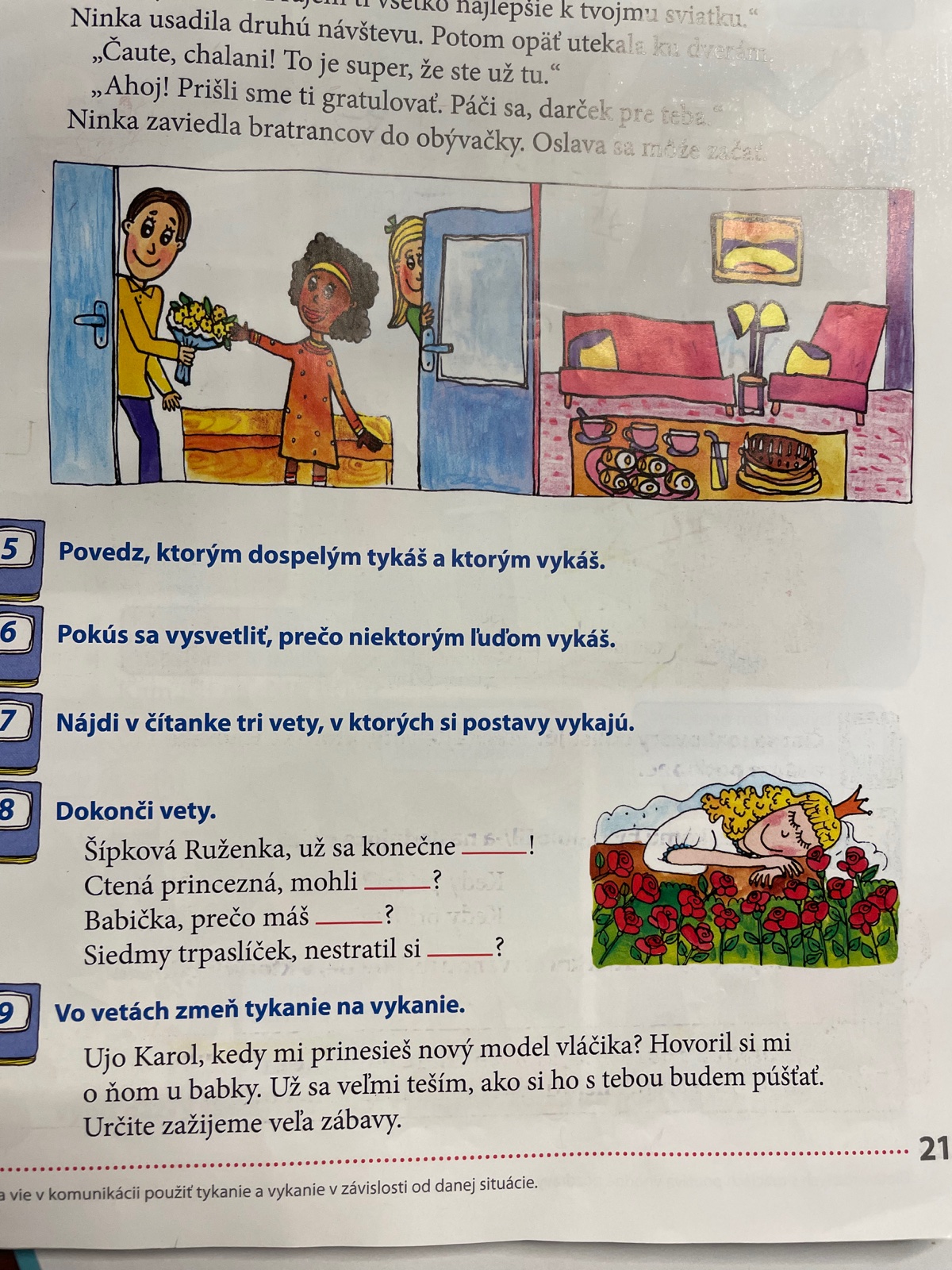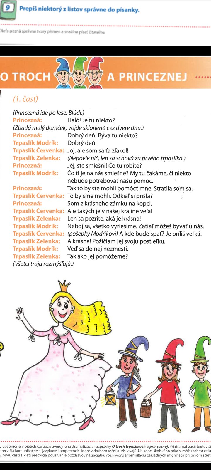 Ak sa nemýlim tak v tej učebnici sú také texty o princeznej a trpaslikoch. Možno tam sa skrýva odpoveď