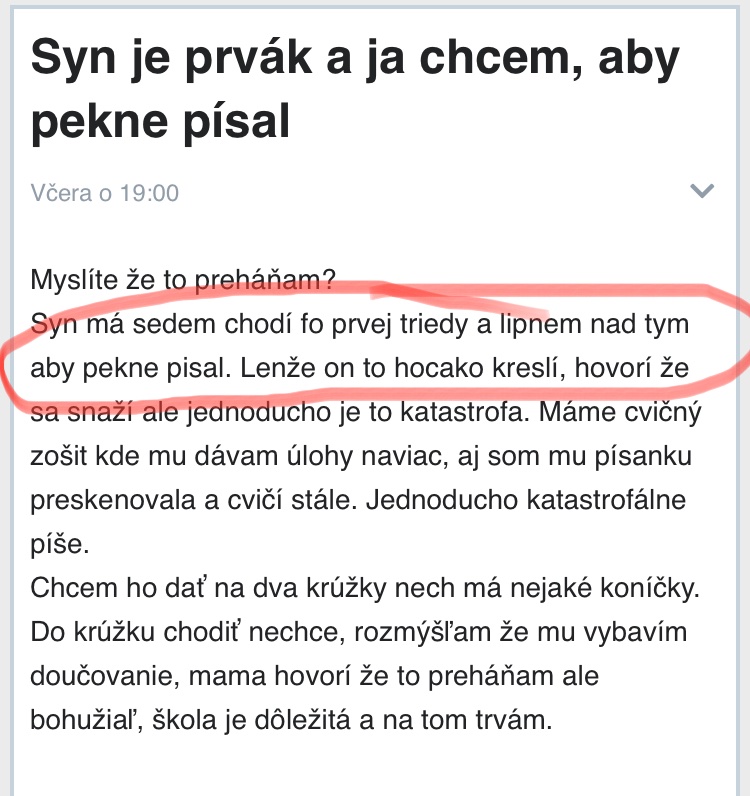 Autorka: XY mamičiek tu píše, že to naozaj preháňaš a ty si si to ešte neuvedomila? Stále ideš svoje. Daj svojmu synovi viac priestoru aj na zábavu, hry, kamarátov a verím tou, že sa zlepší aj jeho písanie. Ak bude pokojný, vyšantený a nie vystresovaný.