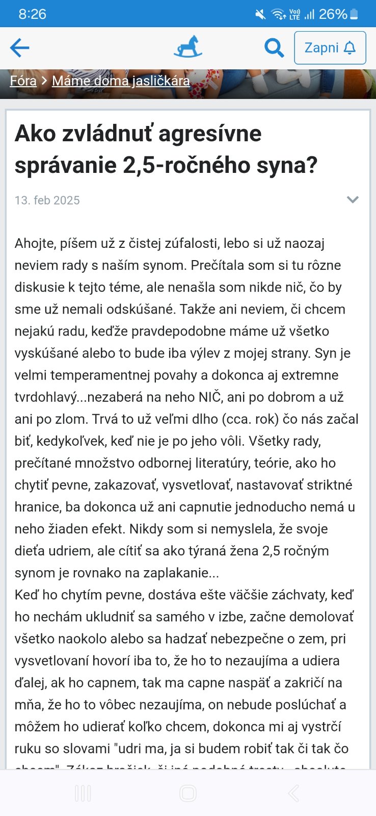 Už nevládzem...naozaj sa cítim ako týrana žena vlastným trojročným synom. Trvá to už extrémne dlho a naozaj som už bezbranná, v podstate ja aj manžel. Skúšali sme už všetky odporúčané metódy, navštívili detskú psychologičku, absolvovali terapiu, podla ktorej je syn v uplnom poriadku. Je veľmi šikovný, ale veľmi ťažko zvláda svoje negatívne emócie a je extremne temperamentný. Stačí, že sa potkne a udrie a už si to ide vybíjať na mne. Nedá sa ho upokojiť, ak sa ho pokúsim objať alebo zabrániť v tom, aby ma udieral, tak ma začne štípať alebo hrýzť. Je to na dennej báze, pravidelne...stačí maličkosť, ktorá ho vytočí a on sa hneď správa agresívne. O tom ani písať nebudem, aké hysáky spraví, keď mu nevyhovieme (čo samozrejme nie a hranice si napriek tomu držíme pevne!)...ale tieto jeho stavy sú už neúnosné. Vôbec na neho NIČ neplatí, tak rýchlo ho chytí amok, že ani sám neviem prečo to robí, aj keď sa ho spýtam, prečo? Tak väčšinou povie...ja neviem, dokonca sa občas aj dodatočne ospravedlní, vie že je to nespravné, ale nevie to kontrolovať. Snažíme sa vyhýbať situáciam, ktoré vyvolávajú u neho negatívne emócie, ale to sa jednoducho NEDÁ, stači ak mu poviem, že ideme domov a on nechce, tak sa premení na malého diabla alebo ho len požiadám o čokolvek a on jednoducho nechce, stačí ak mu v nejakom momente nevenujem dostatok pozornosti a on si ju ide doslova vydobit, pritom ja sa potrebujem iba prave najest, vybavit telefonat a podobne....Nemôžeme s ním ostať zatvorení v byte! V septembri ho čaká škôlka a mám pocit, že z toho tak či tak nič nebude kvôli jeho výbušnej povahe a ja už skončím na psychiatrií. Ja už vážne pochybujem, že dostanem akukoľvek použiteľnú radu a nie preto, že by to neboli dobre rady a nemala by som zaújem o vyskúšanie, ale už sme všetko s manželom skúsili, naozaj všetko a nič nezaberá. Akurát som aj dočítala ďalšiu výchovnú knižku: Malí ľudia veľké emócie...a úprimne, mám pocit, že je to iba ďalšia literatúra do zbierky, keďže na môjho syna, nič z toho neplatí! Takže za mňa iba výlev...rada si prečítam príspevky od skúsených rodičov s podobným problémom, možno mi doporučíte niečo, čo sa osvedčilo vám, ak máte osobnú skúsenosť, ale reagovať na príspevky od mamičiek, ktoré si týmto neprešli alebo na príspevky, ako sme na plnej čiare ako rodičia zlyhali a naša výchova je uplne skazená od základov a sami si za to môžeme nebudem reagovať, keďže to nám naozaj nepomôže.
