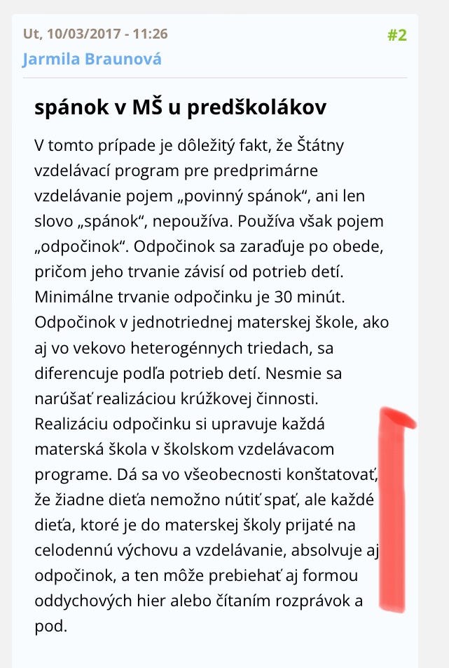 @lienka.7 nesúhlasím. Teda nie úplne. To je kasárenský systém jednotlivec sa musí prispôsobiť skupine. Kto povedal že musia všetky deti spinkať? Stačilo by urobiť nejaké kompromisy a uvoľnenia. Polovica deti tam nespí a z tej polovice dve alebo tri vyslovene trpia. Možno pol hodinku by poležali všetky to by vydržal aj ten nespavec. A potom tie ktoré spinkajú tak budú spať a ktoré nie tak pôjdu vedľa sa ticho hrať. Viem že to nie je ľahké. Ako odísť z izby a nezobudiť ostatné. Ako sa ticho hrať keď je nás tam už 7. Ale keby sa chcelo riešenie sa nájde. Lenže učiteľkám je ľahšie ich dať na dve hodiny spať oni zatiaľ posurfujú po sociálnych sieťach a keď nejaké dieťatko nemôže vydržať v tej strnulej polohe tak mu ukážu že je nejaké zlé, vadné, neposlušné.