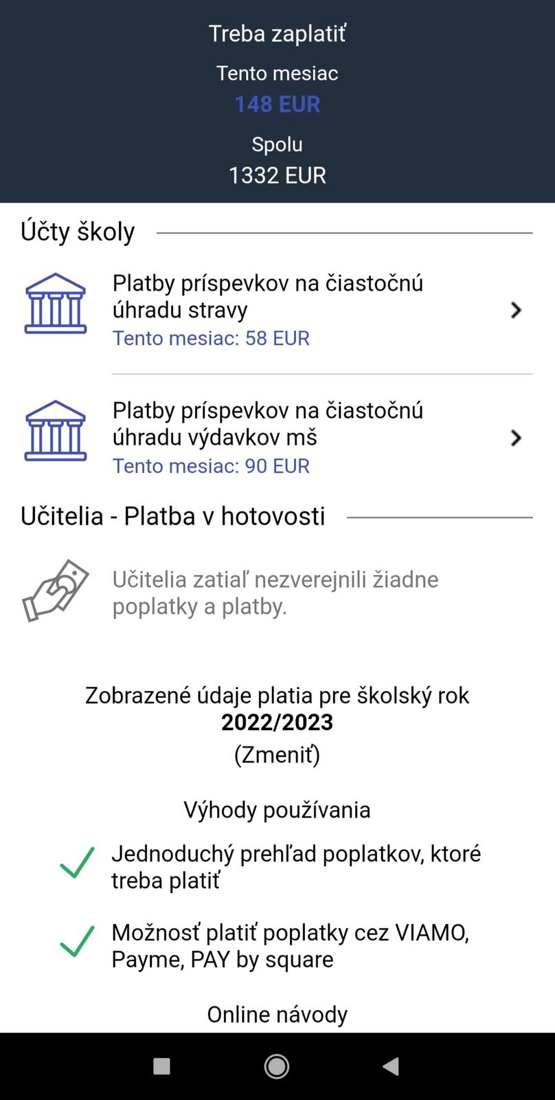 U nás sa platí 20 školné každý mesiac ,36€obedy a ZRPŠ 35€ a 3€ na pitný režim ....