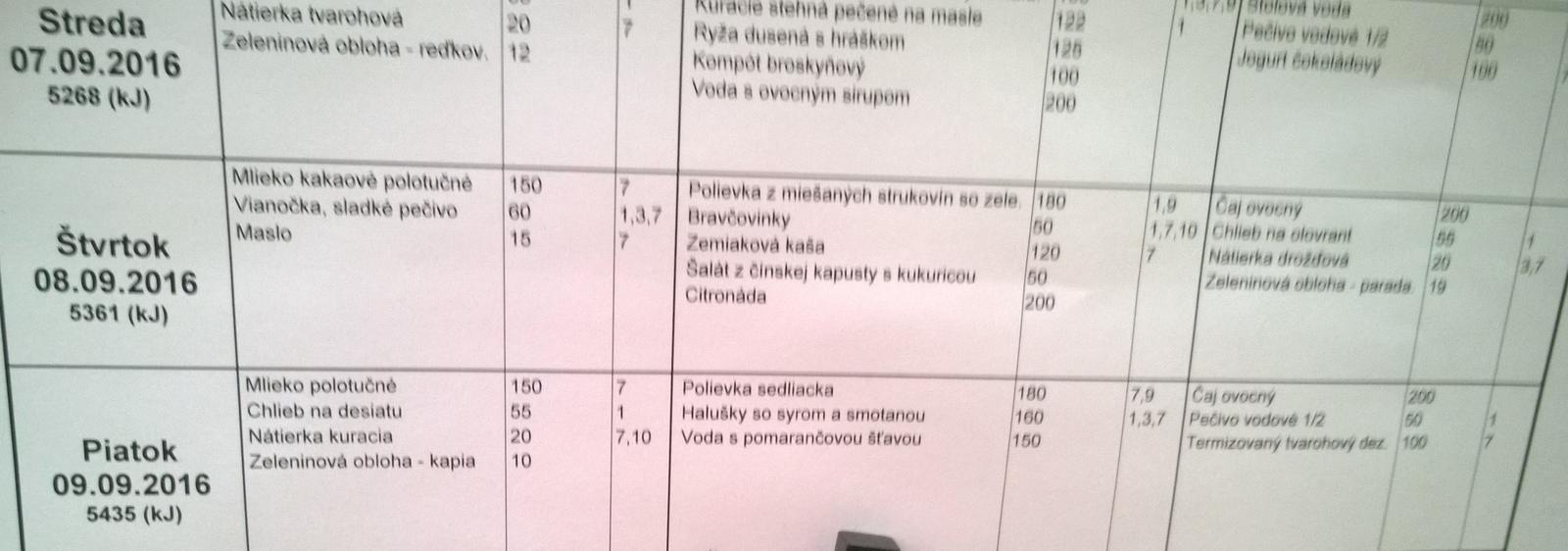 Ahojte, nasa dcerka nastupuje 1.x do skolky a na stranke maju uz vypisany jedalnicek na cely tyzden. Dost som z neho znechutena. Na ranajky (resp. pisu ze desiata o 8:45) maju 3x iba chlieb s maslom a dakym kuskom zeleniny, obedy ze sekana so zemiakmi, parene buchty, ostatne sa mi zdali ok (masko s prilohou). Olovranty plus minus ujdu. Cely den ani 1 ks ovocia, vobec ovocie v skolke nepodavaju. K jedlam maju napisane bud mlieko alebo daku sirupovu vodu alebo cierny caj s citronom.